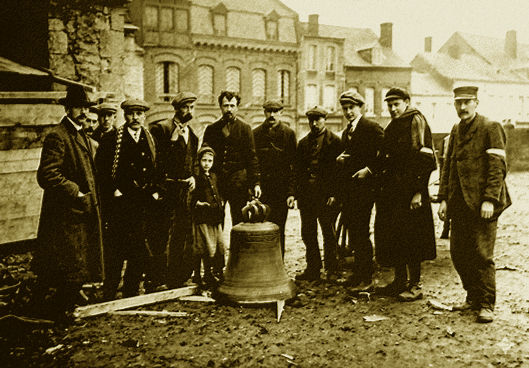 Cette photographie illustre un acte de sauvegarde héroïque à Berlaimont durant la Grande Guerre, alors que l’armée allemande réquisitionnait systématiquement les métaux — et particulièrement les cloches des églises pour les fondre et en faire des munitions — les Berlaimontois ont pris des risques considérables pour cacher et protéger ce symbole de leur village.
