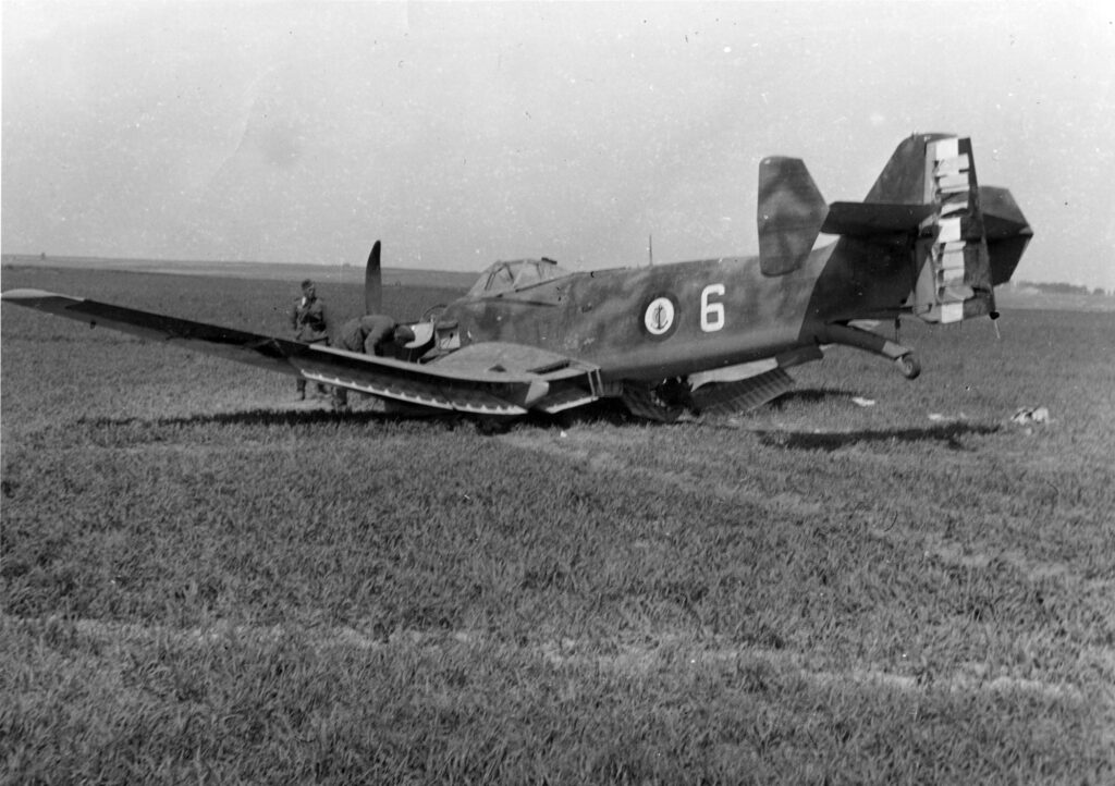 Epave du Loire-Nieuport 411 codé « 6 » de l’escadrille AB4 descendu le 19 mai 1940 à Berlaimont (Nord), examiné par des soldats allemands
